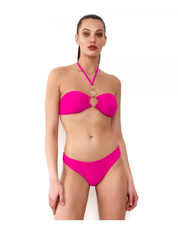 Reggiseno a fascia con imbottitura estraibile, chiusura al collo e sulla schiena, realizzato su tessuto costina tinta unita, un modello dal design moderno e sensuale grazie al prezioso accessorio, triplo anello oro, che simula un elegante collana.